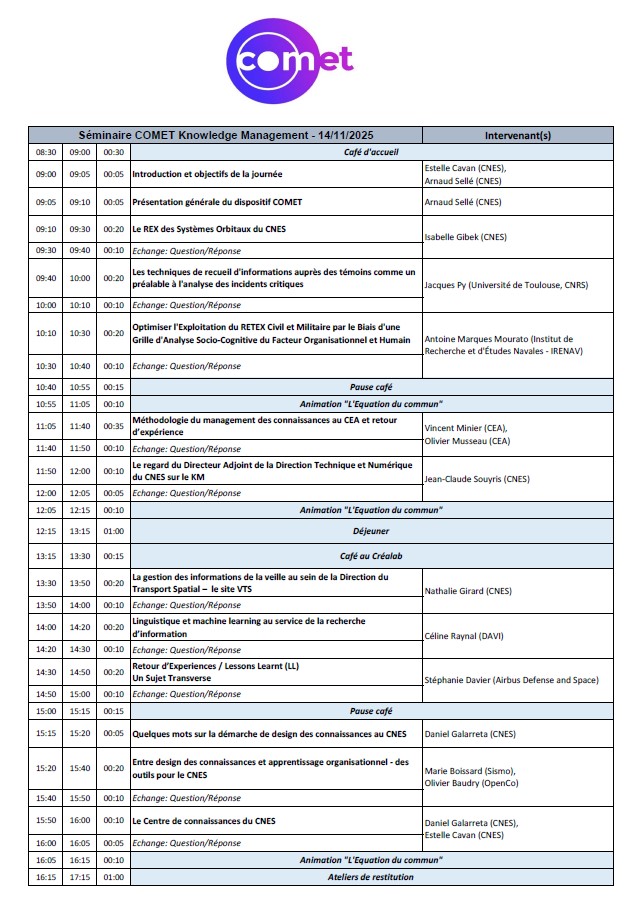 En bref, nous invitons des acteurs du KM (dont le CNES) à présenter leurs activités ou un sujet de leur choix autour de la gestion des connaissances afin d’amorcer de premiers échanges pour construire cette communauté d’expertise COMET.